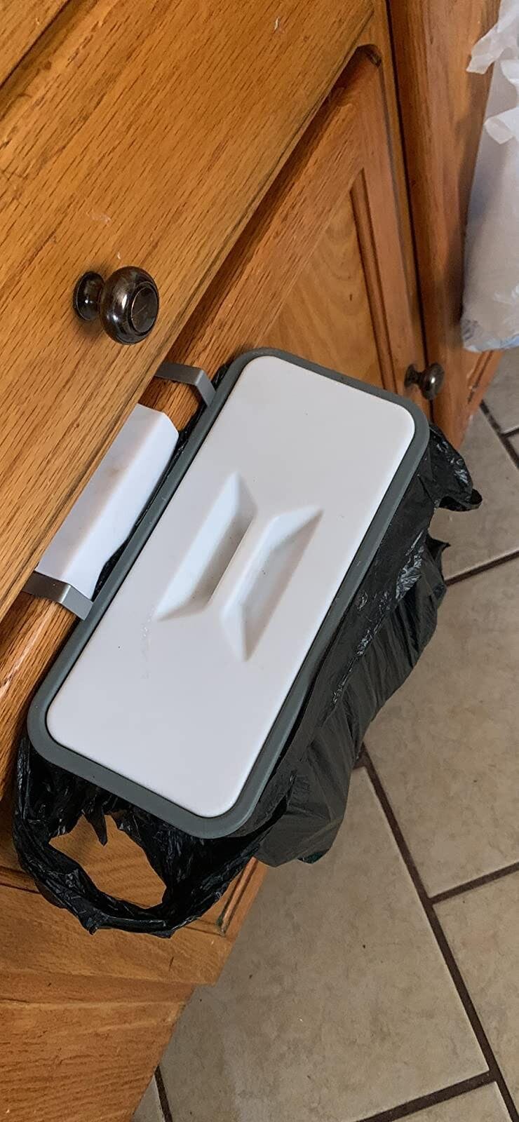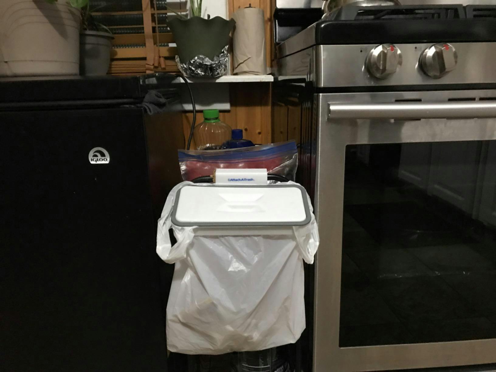 This is a garbage bag holder that can be clipped on any counter or shelf whenever you need to clear out the mess.