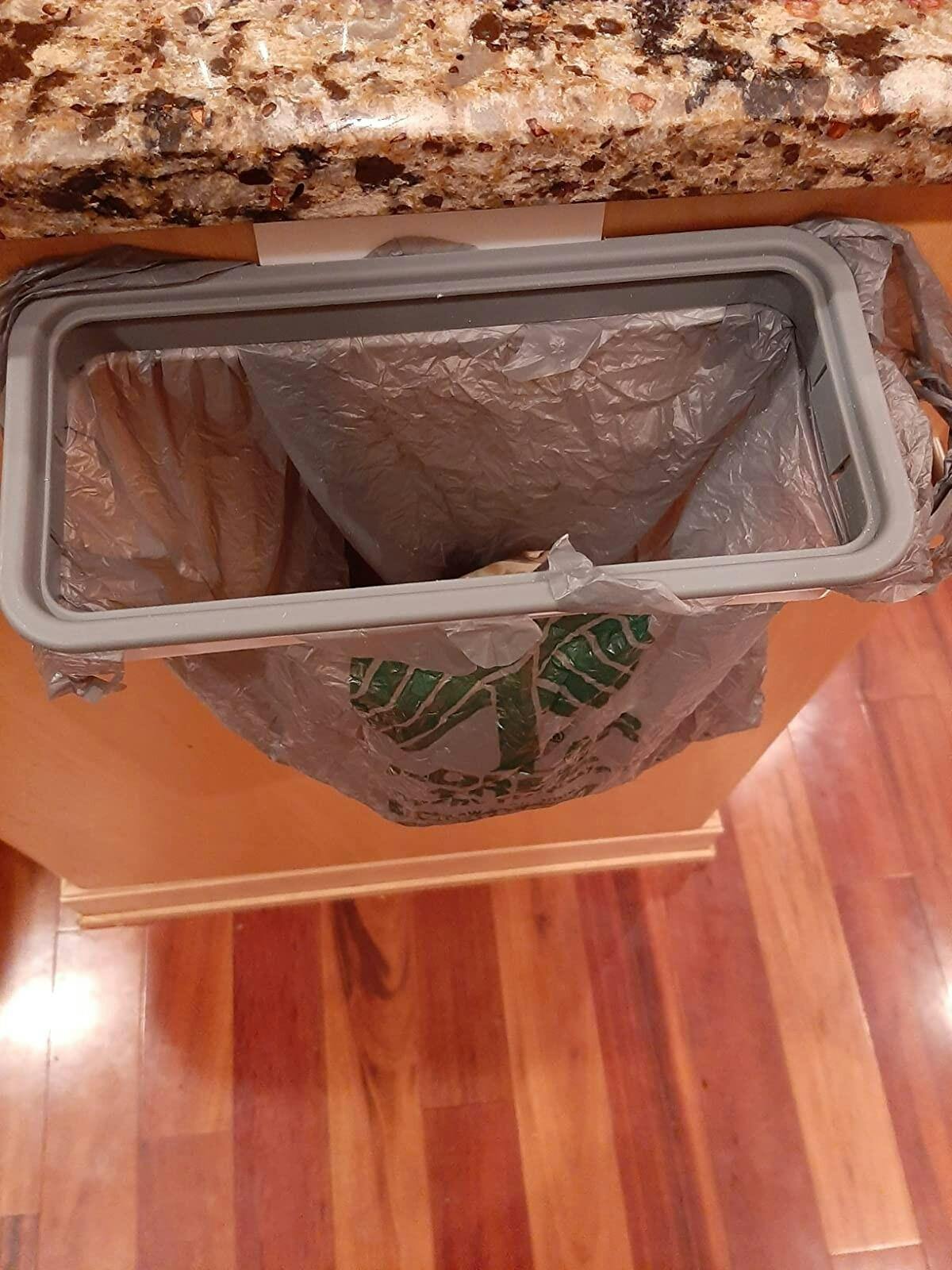 Hands-free and Space Saver: Trash Bag Holder saves a lot of space in the kitchen especially if you have a small kitchen. It also lets you reuse the plastic bags as garbage disposals and requires the littlest efforts to throw the waste away.