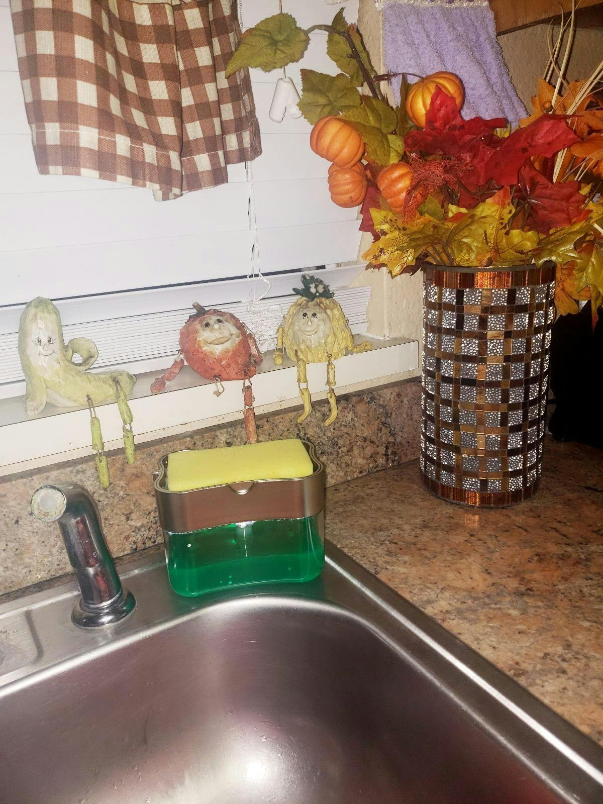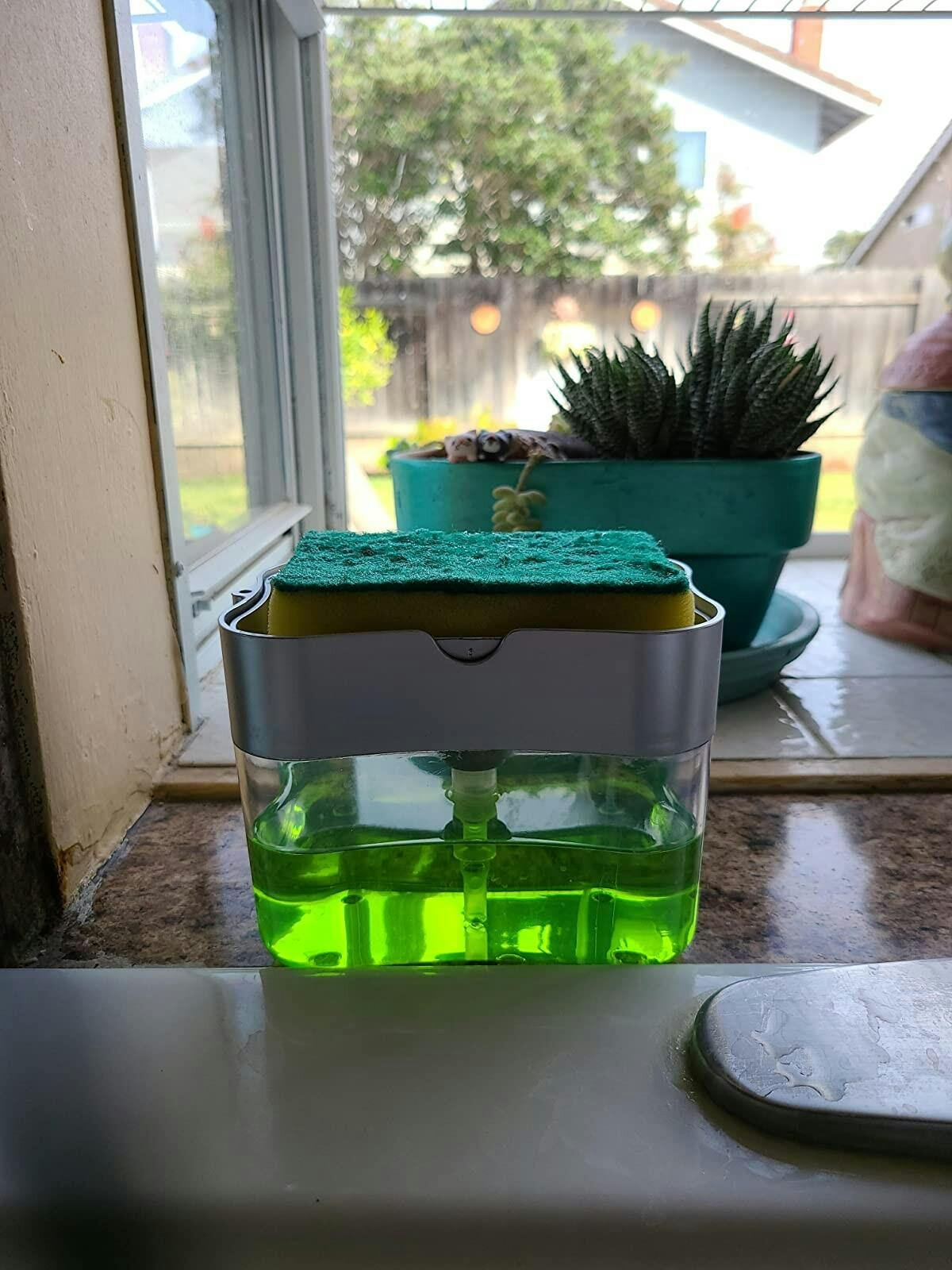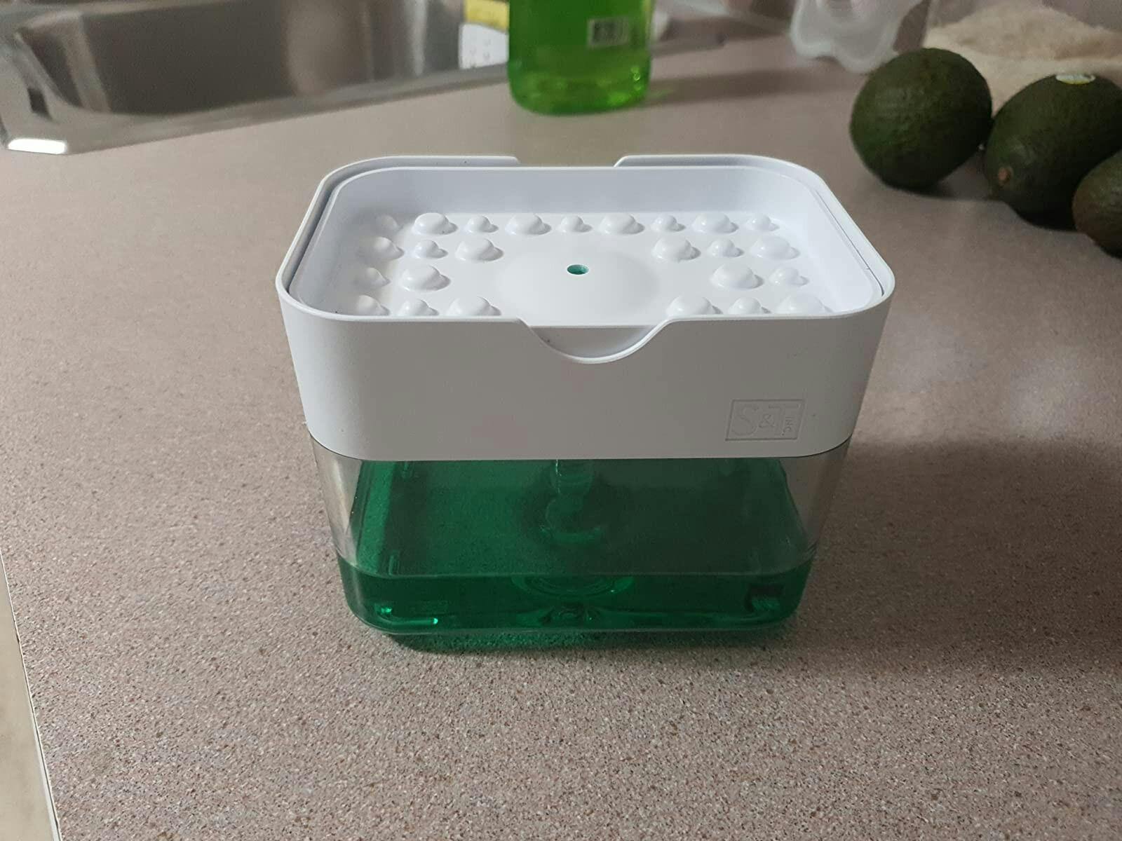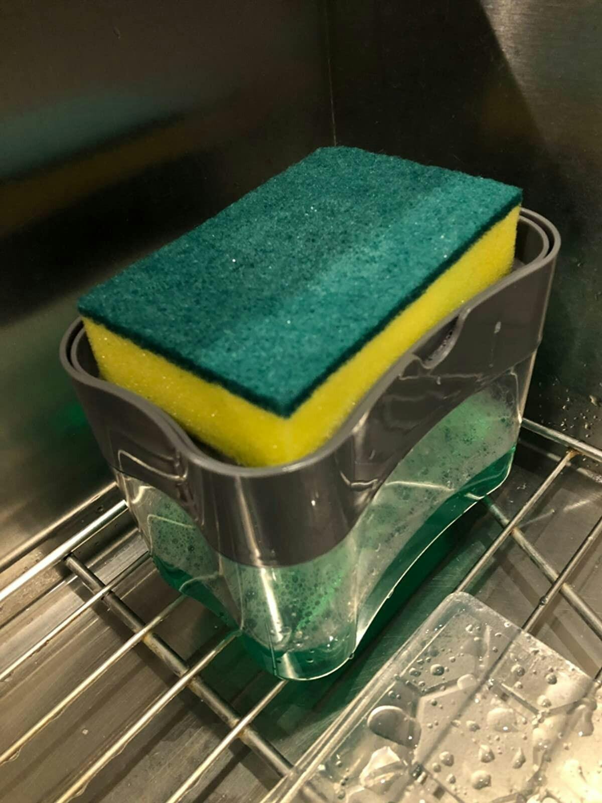 Kitchen Dishwashing Soap Dispenser that allows your scrubber to be kept on top and directly absorb the soap into the scrubber.