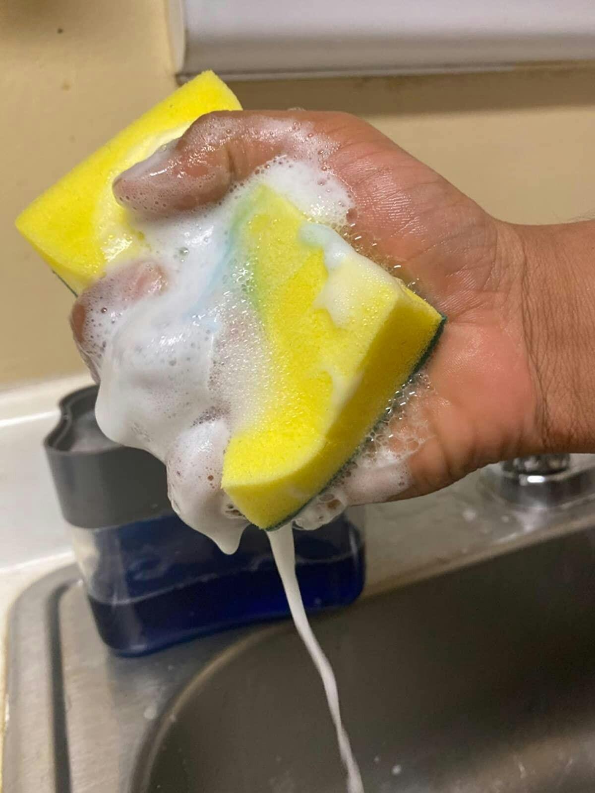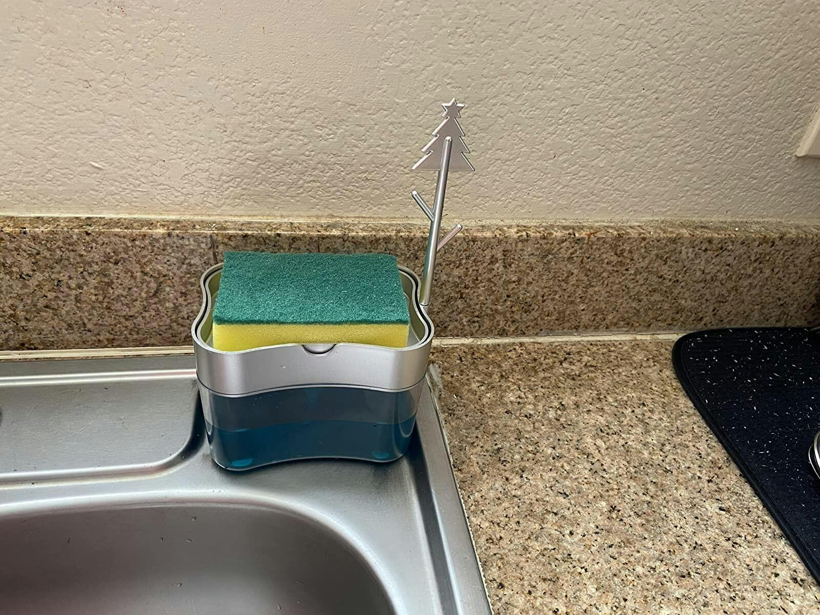 The package includes a sponge that can be stored on top of the dispenser, keeping water off of the kitchen counters.