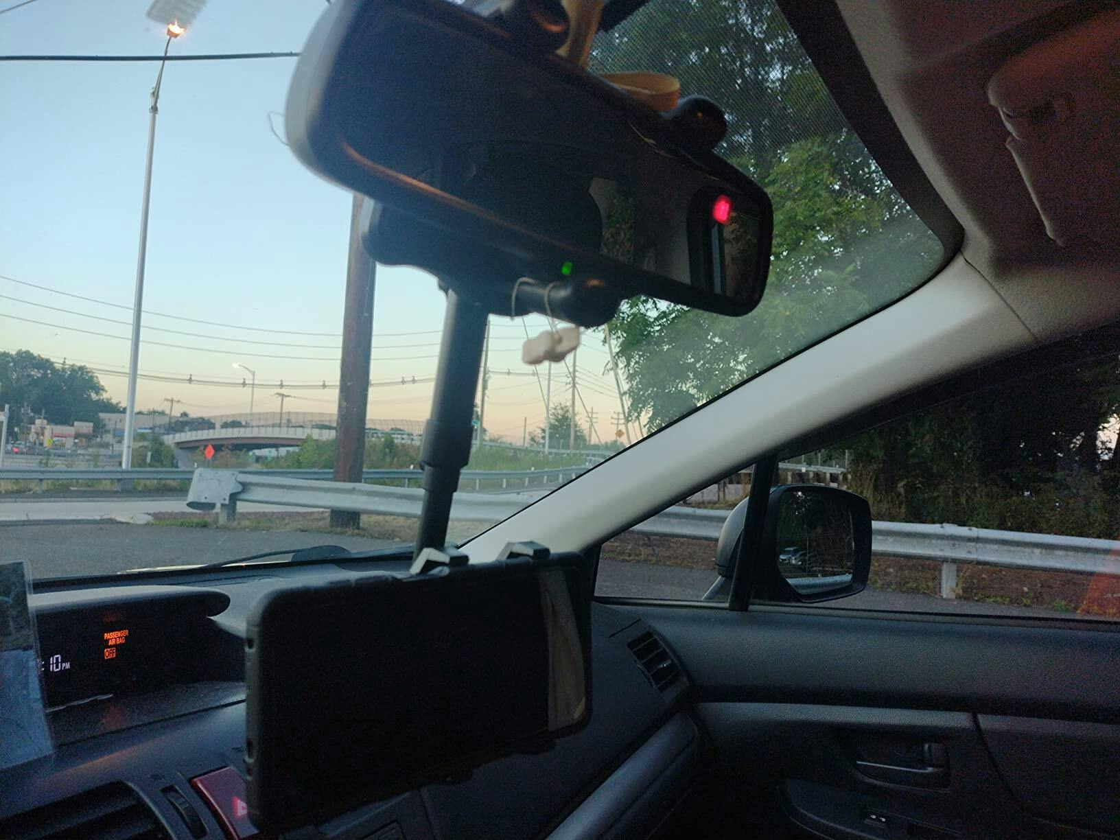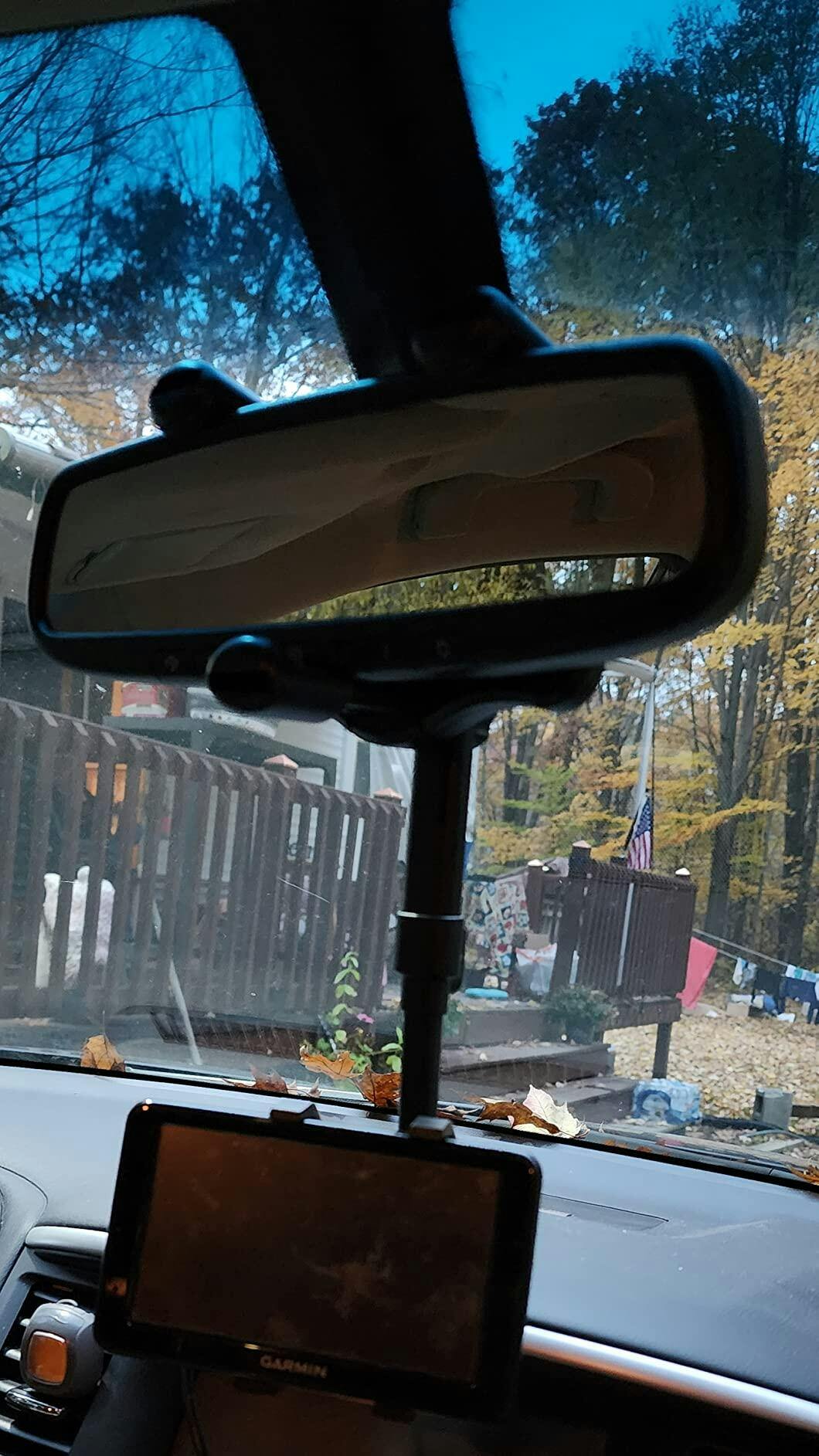 Keep your eyes on the road while using GPS. Drive safer with this rearview mirror phone holder.