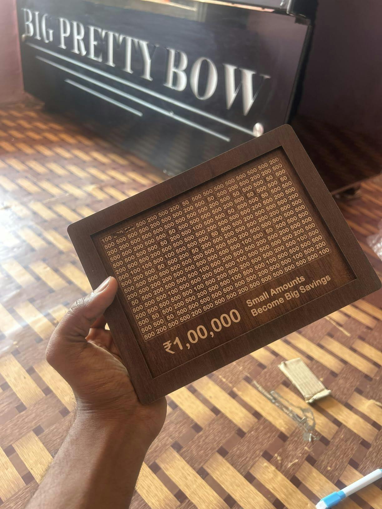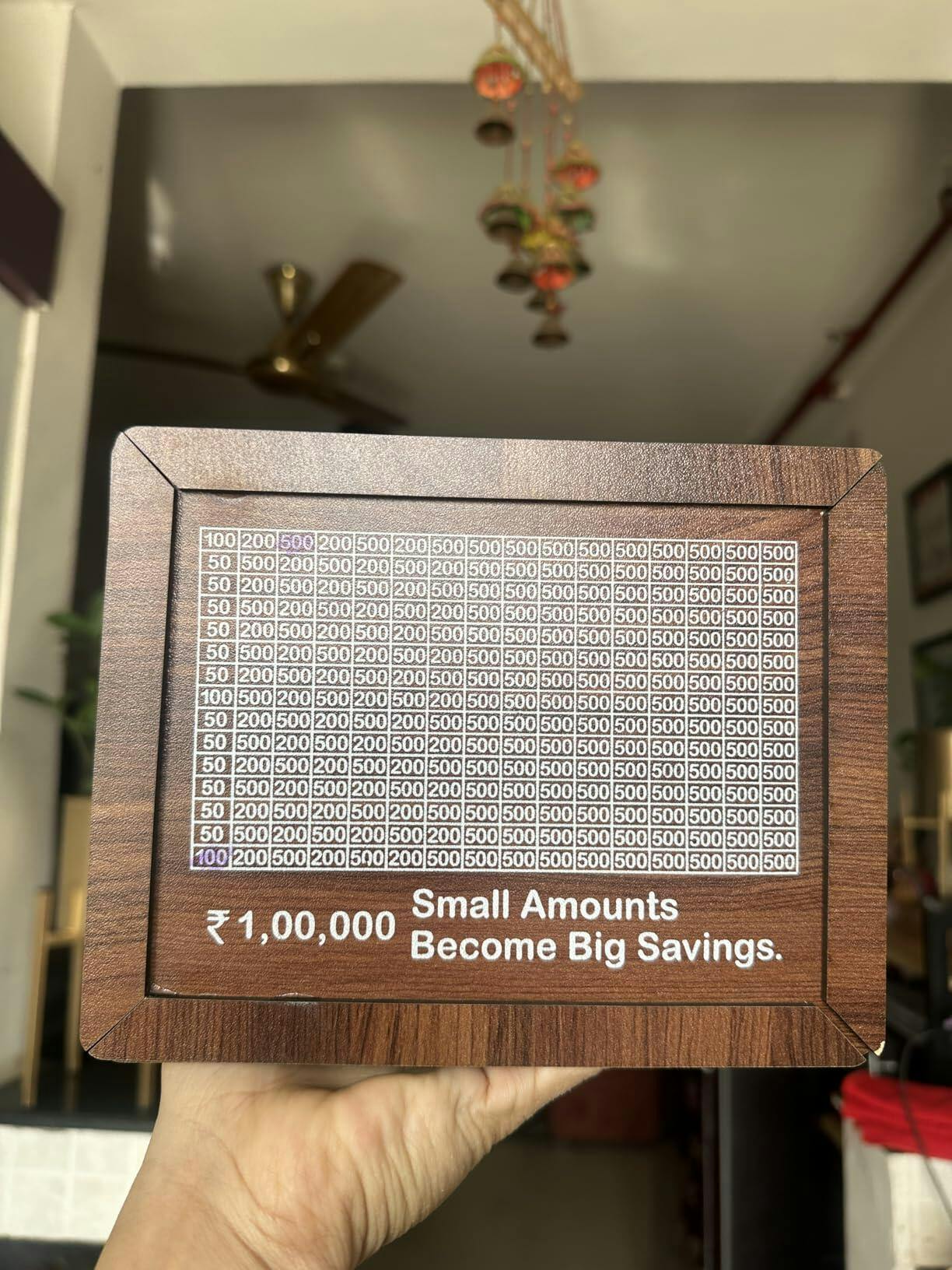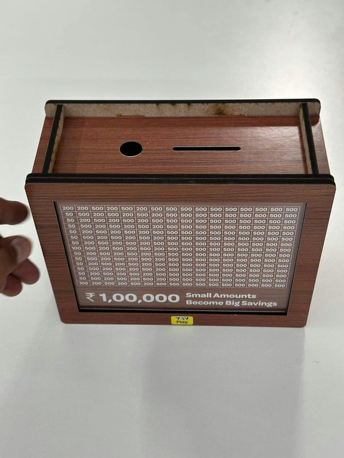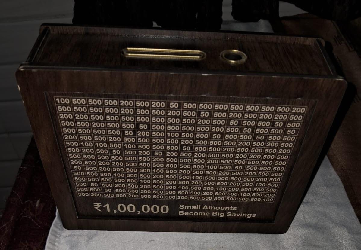 Store up to ₹10,000 in this sturdy wooden money bank. Perfect for both coins and notes, with easy tracking from ₹500 to ₹10,000!