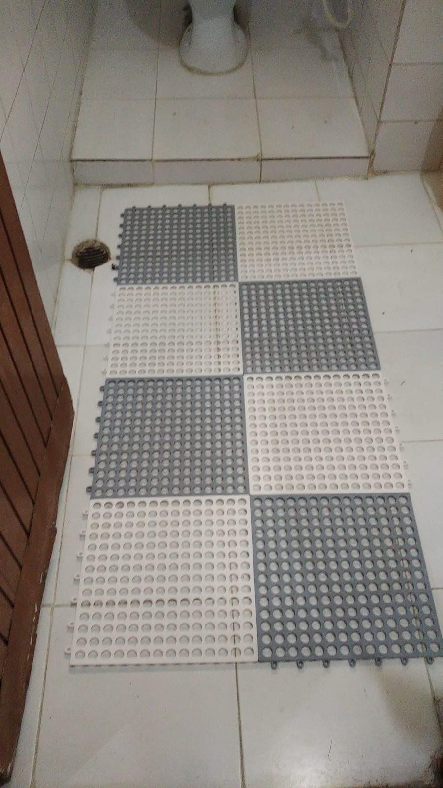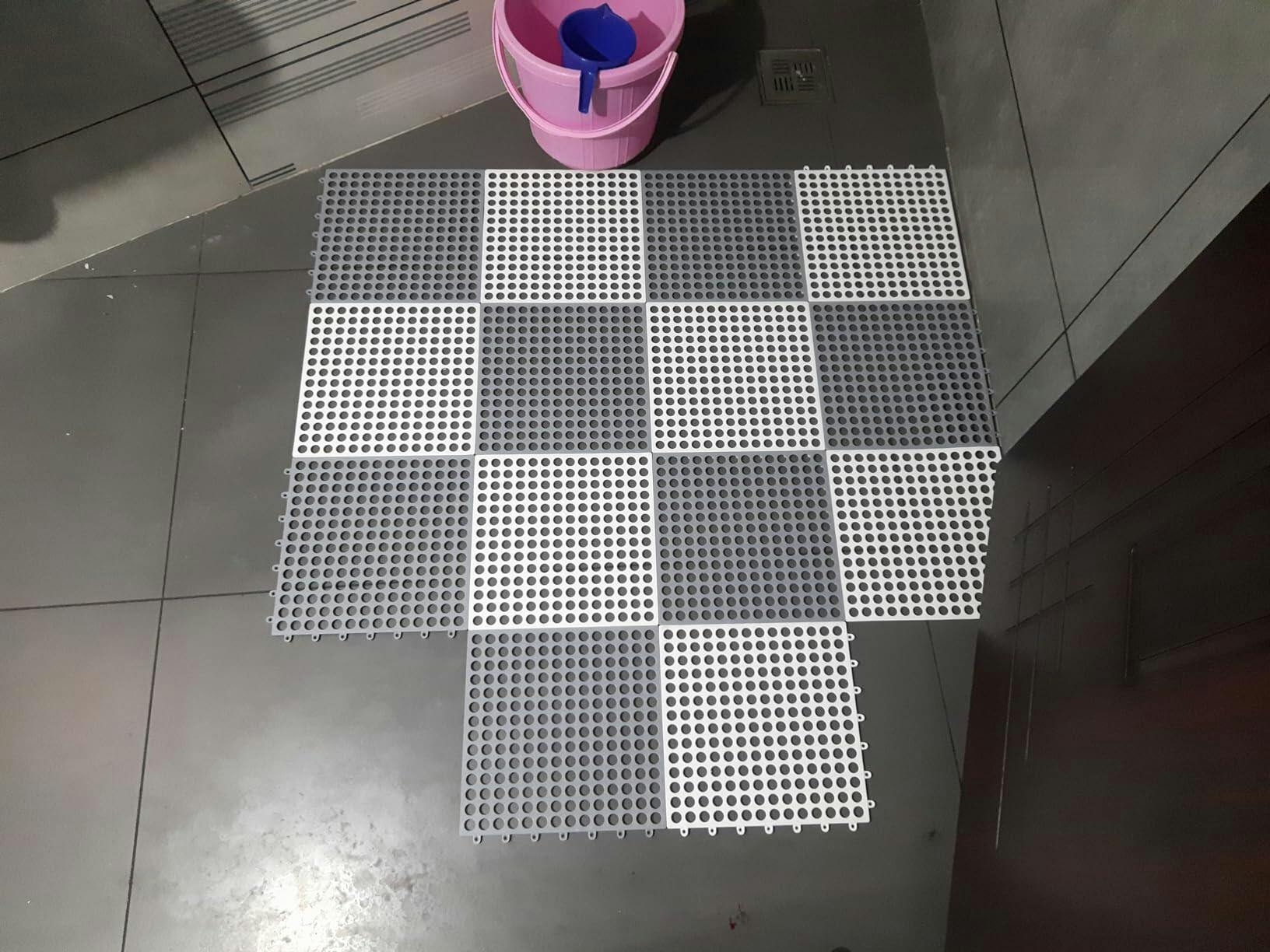 Ensure safety in your bathroom with this set of 6 interlocking rubber bath mats. They're designed to prevent slipping in wet areas like showers and bathtubs, thanks to their drainage holes and non-slip tiles. Perfect for the whole family.