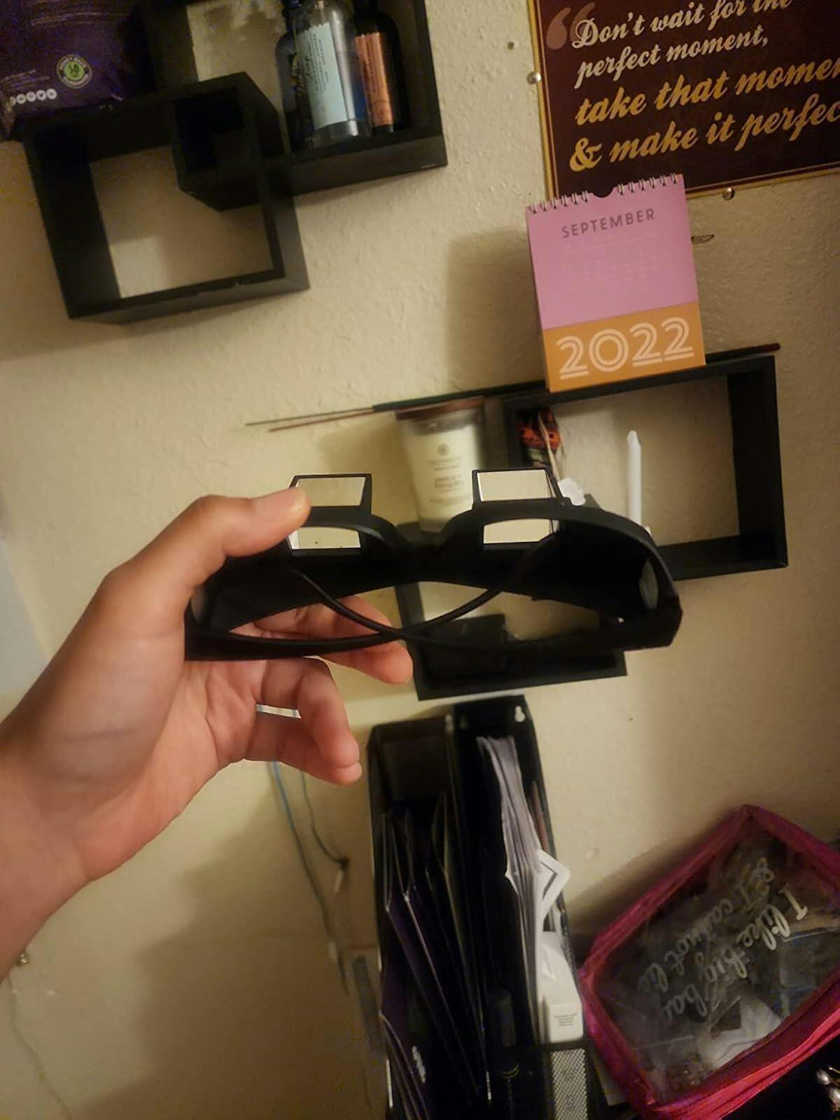 - Put the glasses on your face (wear them over your regular glasses if needed)