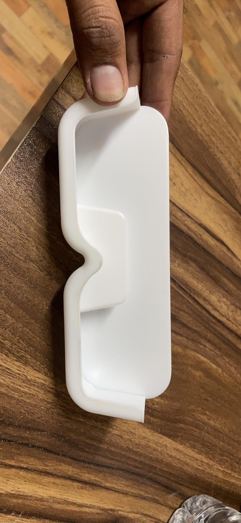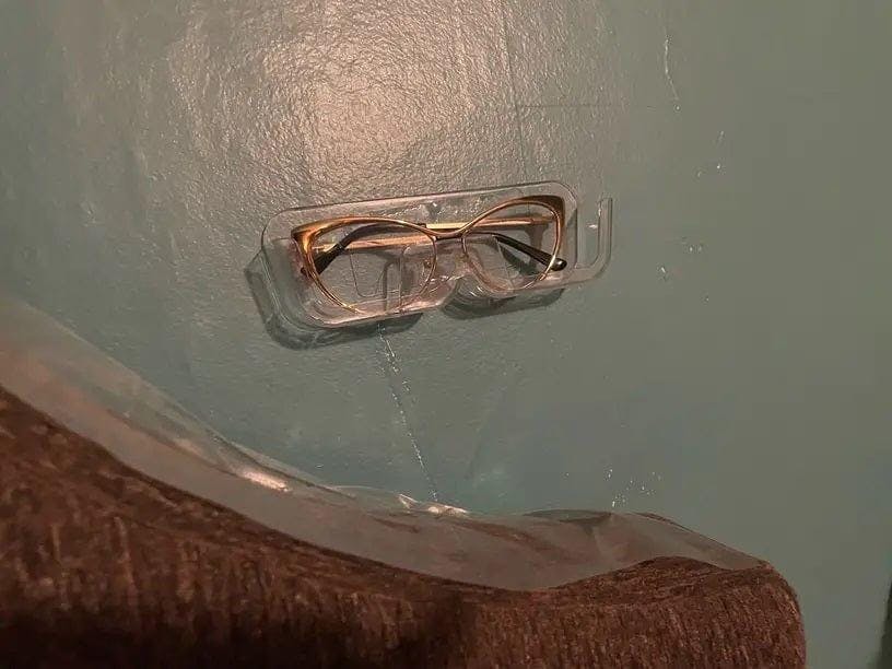 Choose a clean spot on a wall or cabinet. Peel off the adhesive and press the holder firmly against the surface. Your glasses case is now ready for use.